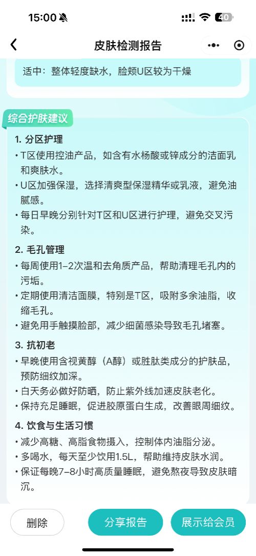 三、【优化】AI检测报告输出内容优化【范围】高级版支持 【功能价值】 报告结构清晰易读,帮助用户快速理解检测结果,同时提升门店专业服务形象,增强客户信任度。 【功能举例】