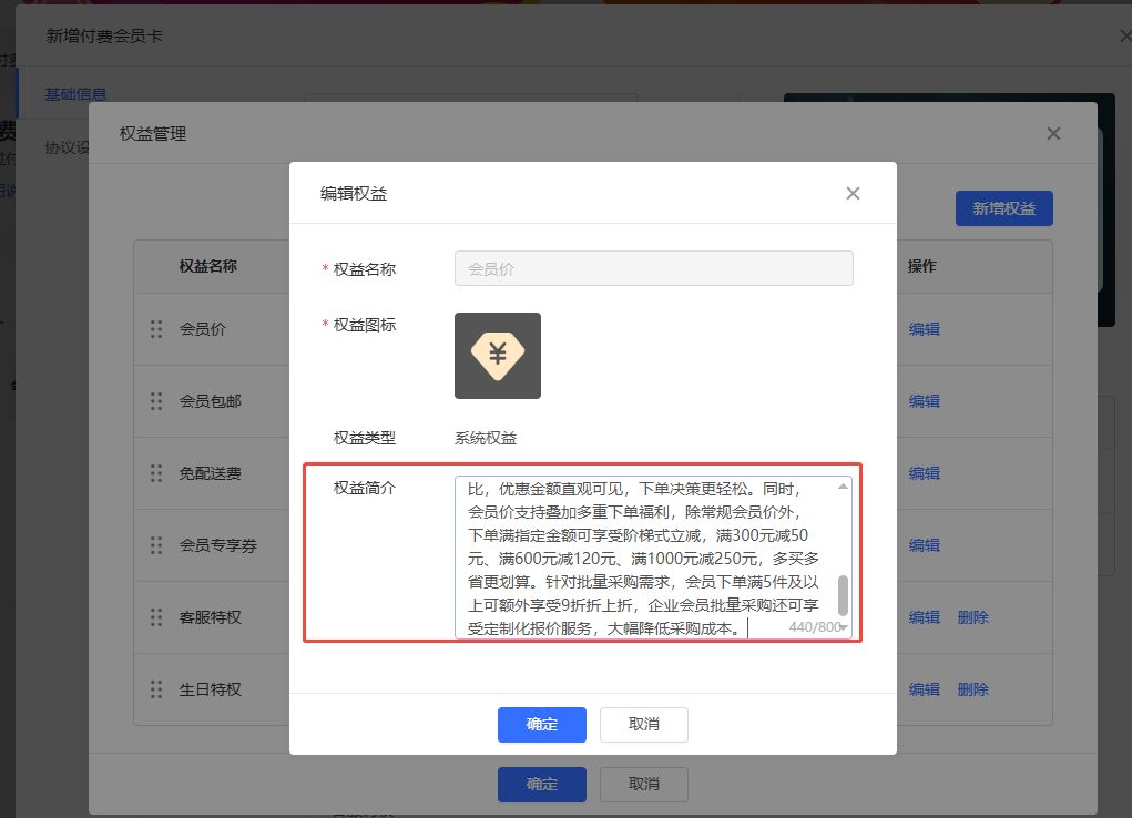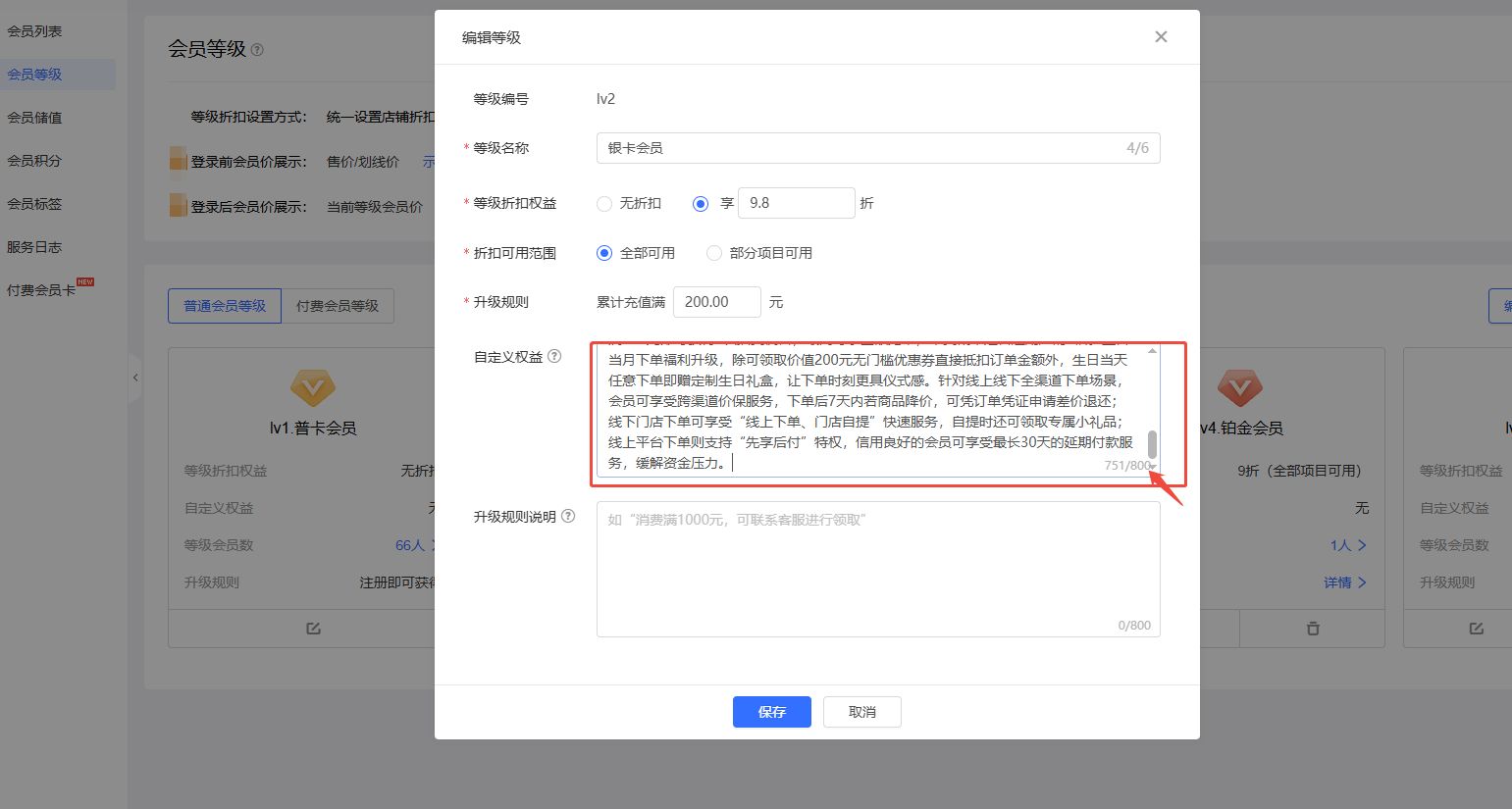 二、【优化】会员自定义权益字数限制放开至800【范围】初级版及以上版本支持 【功能举例】 商家设置付费会员卡权益时,可详细撰写 800 字简介,涵盖折扣力度、专属服务、积分规则等;配置会员等级权益时,也能完整粘贴权益细则,无需缩减内容。 【功能价值】 让商家清晰传递会员权益价值,提升会员感知度与购买意愿,优化会员运营效率。 【描述】