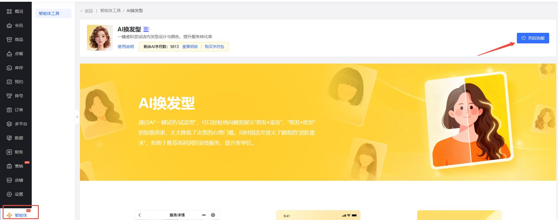 【20260118功能更新】AI换发型发表时间:2026-01-08 16:06作者:智能建站学院来源:joinweb 一、【新功能】AI换发型【范围】高级版限时免费赠送该功能插件 注:其他版本如需使用,可以单独购买AI换发型插件 【功能举例】 美发店顾客在小程序上传照片,使用 AI 换发型功能一键试染奶茶棕发色 + 锁骨发造型,还能预览短发 + 羊毛卷的效果,直观看到不同造型适配度。 【功能价值】 ①提高成交转化率,减少跑单:当顾客看到自己心仪的虚拟效果后,购买意愿会急剧增强,能有效锁定顾客; ②激发消费欲望,提升客单价:商家可以预置店内的主打发型、热门发色、特色烫染套餐中,引导顾客优先体验这些高利润项目,实现精准营销和套餐化销售; ③运用社交传播,低成本引流:顾客在体验AI试发型时,通常会生成有趣、好看的效果图,并乐于分享到小红书、朋友圈等社交平台;为门店带来低成本的天然流量。 【描述】 1.新增“AI换发型”智能体应用